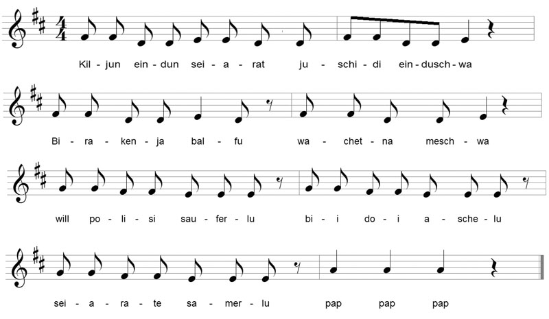 Eine "Transliteration" des Refrains zum "analogen Nachsingen". Im Video (falls Ihr Browser das zulässt) ist der Text entlang der Musik zu sehen: