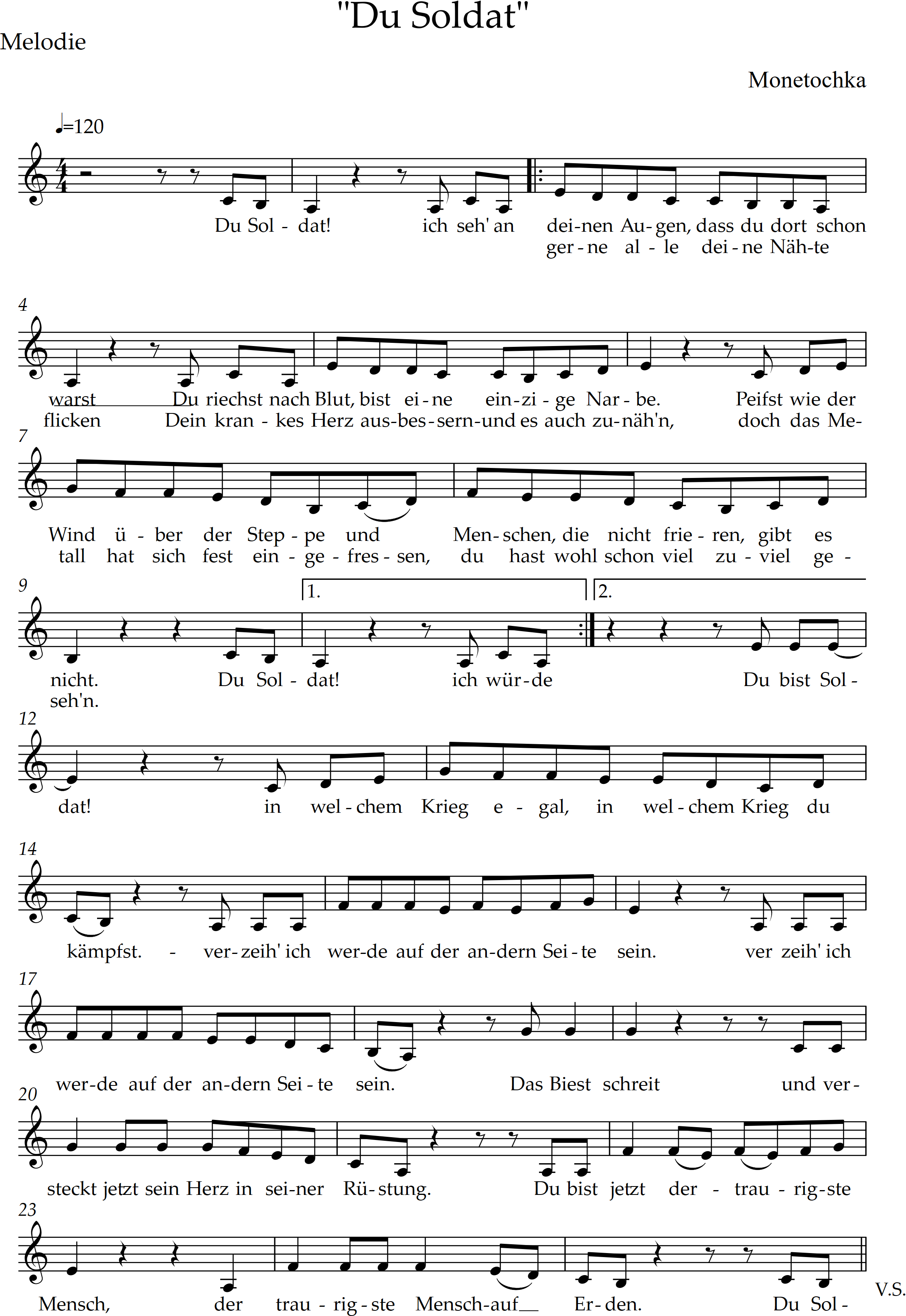 ... ist Autorin des (im Oktober 2025) noch nicht veröffentlichten Liedes Du Soldat, das sie im Heimstudio aufgenommen hat.